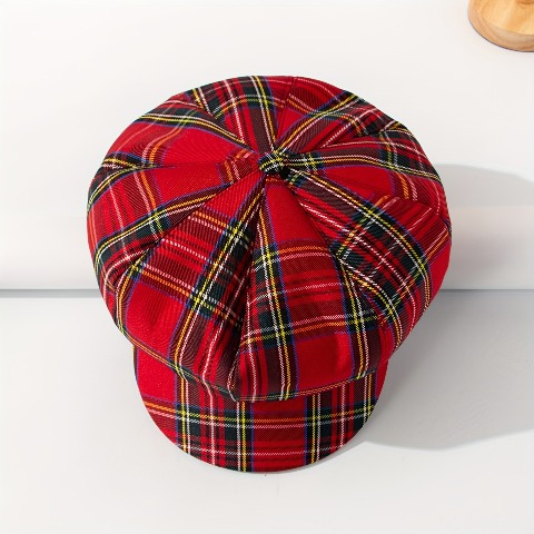 Women's Red Checkered Newsboy - Retro British Style Lightweight Octagonal Brimmed Hat with Tartan Pattern, Durable Winter Headwear for Casual, Office & Formal Outfits | Vintage-Inspired Structured Design, Versatile All-Season